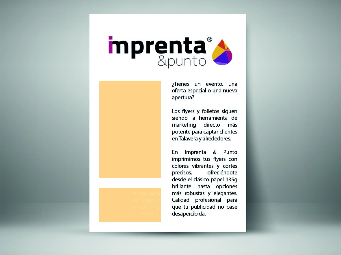 «El flyer o folleto publicitario es, sin duda, la herramienta más rentable para dar a conocer ofertas, eventos o aperturas de negocios en Talavera. En Imprenta & Punto imprimimos tus flyers en diversos tamaños (siendo el A5 y el A6 los más populares) y gramajes (desde 135g hasta 170g). Gracias a nuestra tecnología de impresión offset y digital, garantizamos colores vibrantes y una nitidez absoluta en los textos. Es la solución perfecta para campañas de buzoneo masivo donde buscas el menor coste por impacto sin renunciar a una imagen profesional.»