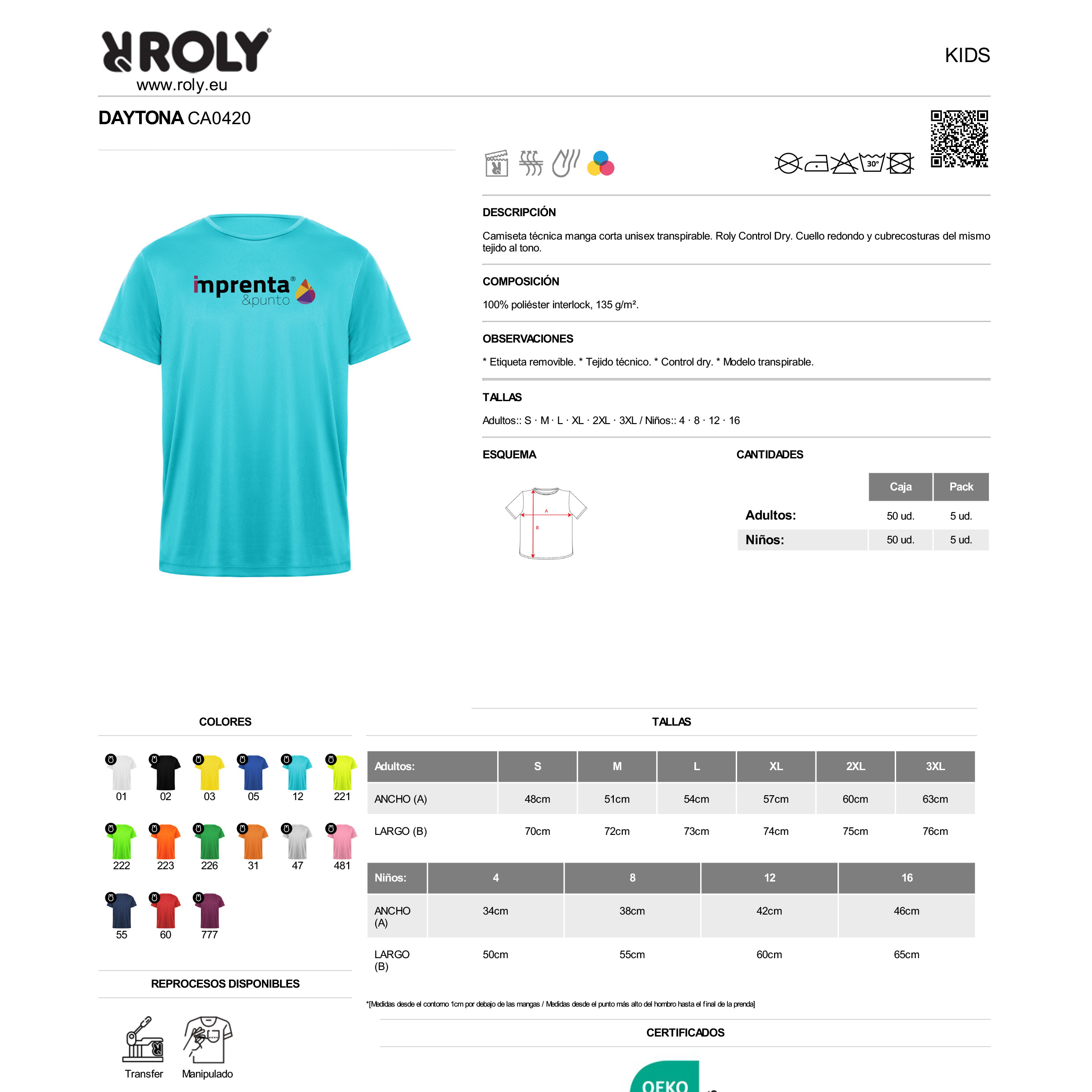 ✅ Gama PLATINO (Roly Daytona): 100% Poliéster (135gr). Tejido piqué de alta calidad con tacto suave y corte ergonómico. Más resistencia y mejor acabado.