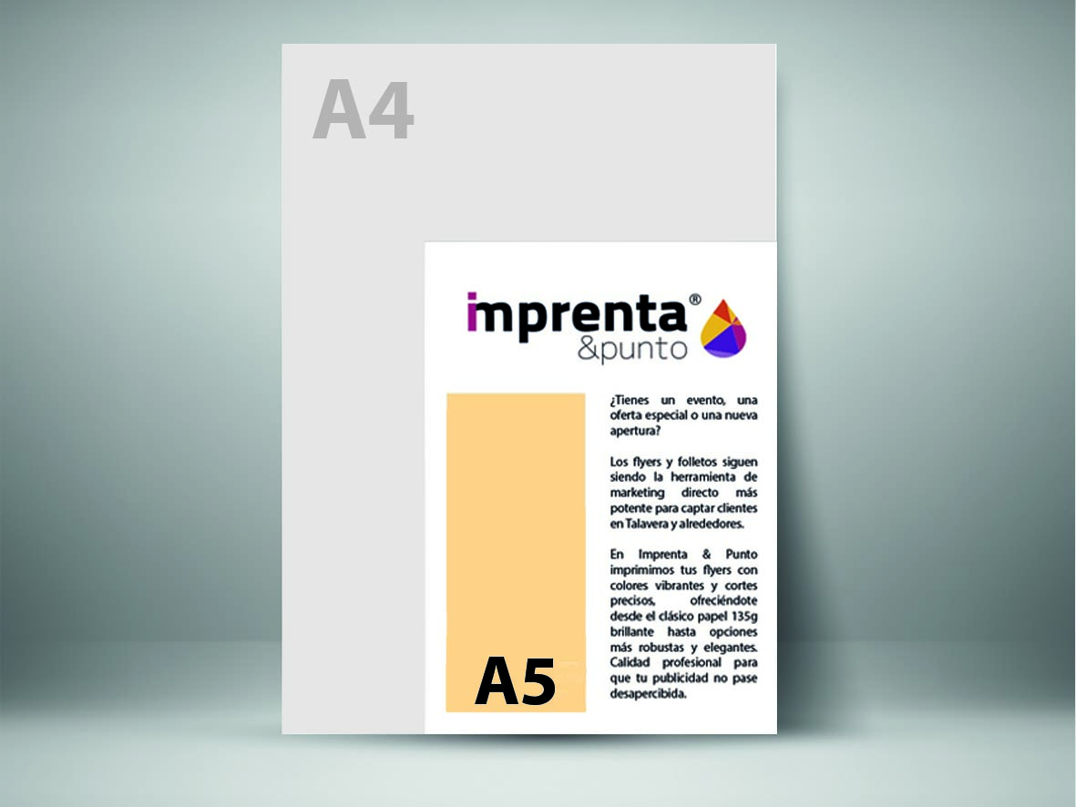 - Tamaño compacto: El tamaño A5, que mide aproximadamente 148 x 210 mm, es la mitad de una hoja A4. Esto los hace fáciles de manejar, transportar y distribuir. Gracias a su tamaño, son ideales para entregarlos en mano, colocarlos en buzones o en puntos estratégicos de afluencia de público.