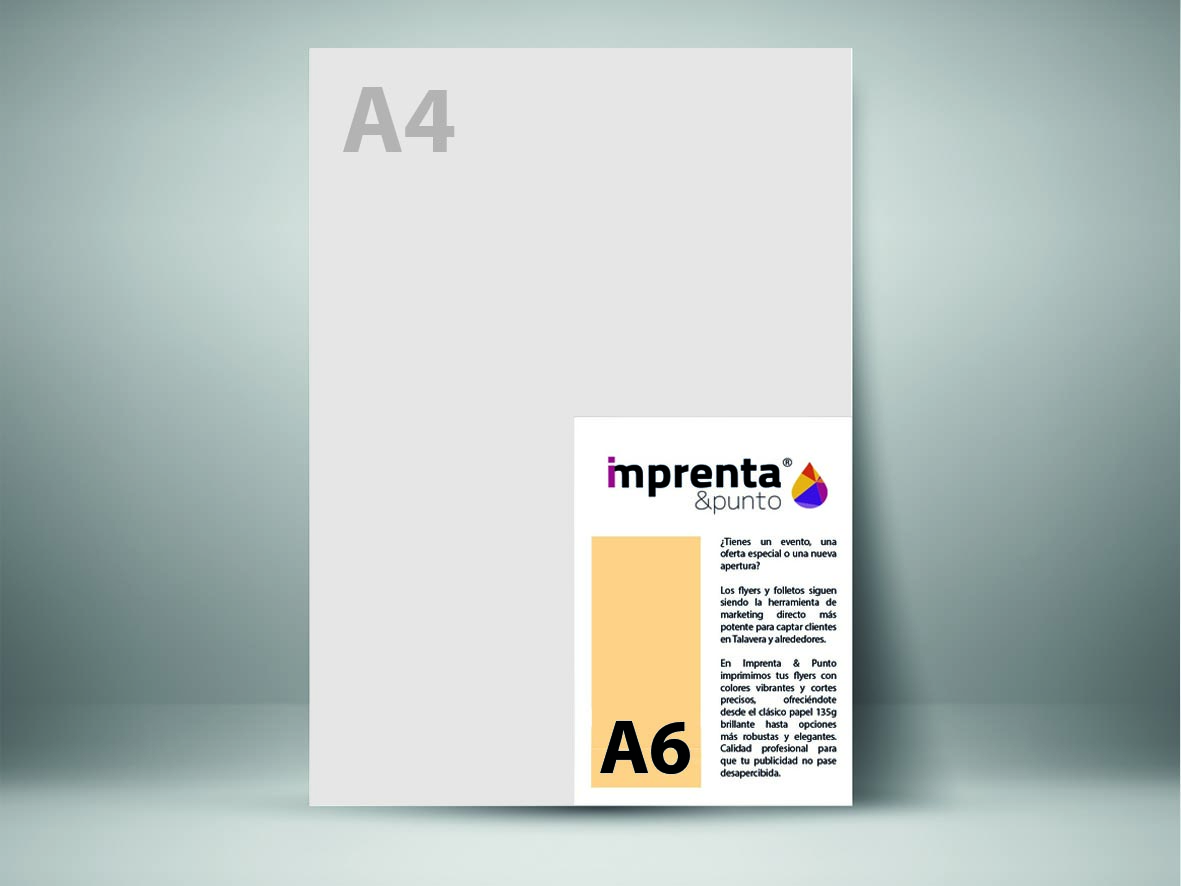Los Flyers A6 son folletos de tamaño pequeño, con dimensiones de aproximadamente 105 x 148 mm, más grandes que las tarjetas de visita que suelen medir 85 x 55 mm. Su tamaño compacto los hace fáciles de distribuir, guardar y llevar a cualquier lugar. A pesar de su tamaño reducido, ofrecen un espacio suficiente para incluir información relevante, imágenes llamativas y diseños creativos que reflejen la identidad de tu marca o evento.