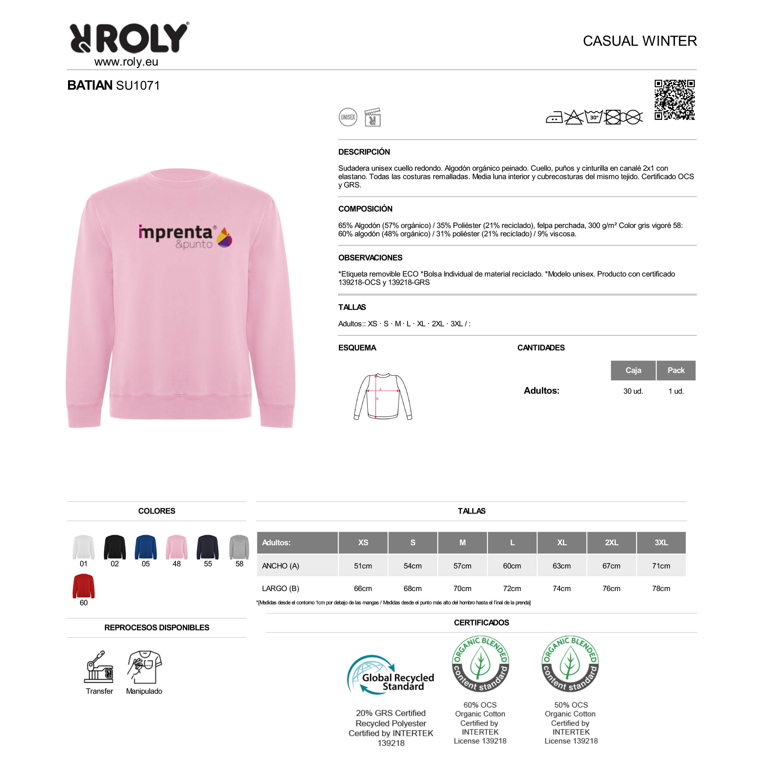 Gama PREMIUM – Roly Batian (Orgánica): La joya de la corona para empresas comprometidas con el medio ambiente y el confort extremo. Confeccionada con algodón orgánico OCS y poliéster reciclado RCS, la sudadera Batian ofrece un tacto de lujo y una suavidad inigualable. Es la prenda ideal para merchandising de alta gama o para quienes buscan una prenda sostenible de máxima distinción.